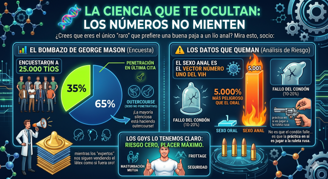 ⚠️ Los Datos que Queman: El sexo anal es el vector número uno del VIH. Es un 5.000% más peligroso que el oral. No es que el condón falle (que falla un 10-20%), es que la práctica en sí es jugar a la ruleta rusa. Los G0YS lo tenemos claro: riesgo cero, placer máximo.