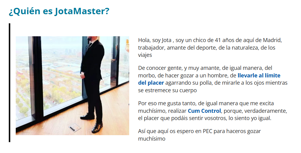 Jotamaster es nuestro maestro Cum control, quien va a estar en nuestra SeDe de Madrid-Argüelles dando placer con su técnica.